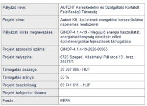 A telephely éves villamos-energia fogyasztása igen jelentős (~évi 472 138 kWh), amely évi több millió forint költséget jelentett a vállalkozás és a bérlői számára. A telepített 260 kWp teljesítményű napelemes rendszer telepítésével az éves villamos-energia fogyasztásunk 60,58%-át tudjuk kiváltani, amellyel így költségeink is jelentős mértékben csökkennek.